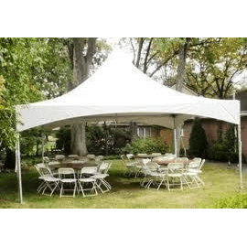 Find reliable and sleek outdoor coverage with the 20 x 20 High Peak Frame Tent Package. This tent can be setup on any surface (grass/ patio/ asphalt) and is great for weddings, showers, graduations or corporate gatherings. It includes one 20 x 20 high peak frame tent, (4) 60" round tables, and (32) white folding chairs —